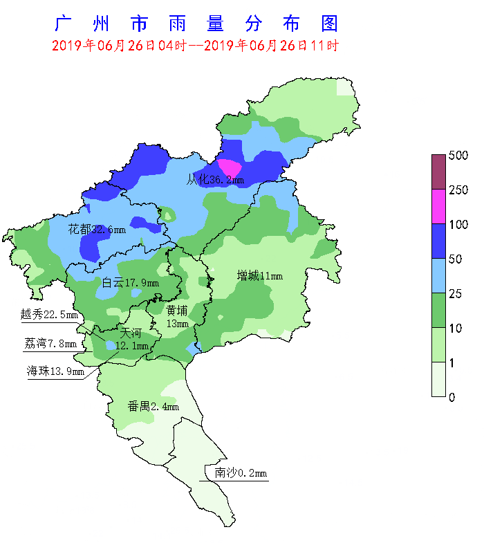 26日凌晨至上午,廣州市從化、花都區出現了暴雨局部大暴雨,白云、黃埔、增城、市區出現中到大雨,番禺、南沙出現小雨,并伴有強雷電。據氣象水文監測,26日04時至11時,全市平均面雨量為17.9毫米,共有30個站點錄得50毫米以上降水,2個站點雨量在100毫米以上。從化區荔泉路錄得最大降水量129毫米和最大小時雨量65.1毫米。越秀區永安橫街錄得市區最大累積雨量33.5毫米,越秀區北京街錄得市區最大小時雨量31.6毫米。各區最大累積雨量(單位:毫米):從化129,花都82.4,增城49,黃埔39.4,白云34.9,越秀33.5,海珠31.1,天河25.6,荔灣13.1,番禺12.9,南沙1.5。此次過程以強降水為主,最大陣風僅5級,出現在增城石灘鎮。