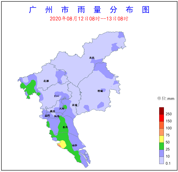 2020年8月12日08時至13日08時,廣州的偏西部地區出現了中到大雨局部暴雨,并伴有6-8級瞬時大風。共有53個站點錄得25-50毫米降水,6個站點錄得50-100毫米降水,全市平均面雨量為13.1毫米。最大降雨量為85.2毫米,最大小時雨量為69.5毫米,均出現在南沙區大崗鎮。全市大部地區都出現了6級以上大風,其中增城區珠村錄得最大陣風17.4米/秒(8級)。
