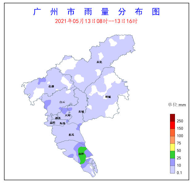 受低層偏南氣流影響,5月13日8時至13日16時南沙區(qū)出現(xiàn)了中到大雨,局部暴雨,其余各區(qū)大部出現(xiàn)了小到中雨,局部伴有6-9級陣風(fēng)和強雷電。全市共有2個測站(占比0.55%)雨量超過50毫米,9個測站(占比2.49%)雨量超過25毫米,南沙區(qū)珠江街錄得全市最大累積雨量63.7毫米,同時該站錄得全市最大小時雨量33.3毫米。另外,全市共有20個測站(占比5.52%)錄得6級以上陣風(fēng),花都區(qū)花東鎮(zhèn)花都區(qū)花東鎮(zhèn)錄得全市最大陣風(fēng)23m/s(9級)。