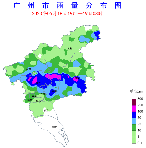 5月18日19時至19日08時,受高空下滑波動和近地層切變線影響,我市中部地區(白云-黃埔-增城)出現了暴雨、局部大暴雨降水,并伴有短時強降水、雷雨大風、強雷電等強對流天氣。期間,全市共有361個測站(77.5%)出現降雨,平均雨量21.5毫米,其中15個測站(3.2%)雨量在100~250毫米之間,37個測站(7.9%)雨量在50~100毫米之間,黃埔區龍湖街錄得全市最大累積雨量180.1毫米。各區平均雨量(單位:毫米):黃埔區47.5,白云區44.7,增城區35.4,花都區24.9,越秀區20.2,天河區19.5,荔灣區19.5,從化區12.2,海珠區10.3,番禺區0.9,南沙區0。過程雨強較大,全市有109個測站錄得小時雨量超過20毫米的短時強降水,其中15個測站小時雨強超過50毫米,黃埔區蘿崗街道辦錄得最大小時雨強84.8毫米。同時,過程還伴有強雷電和雷雨大風,全市共117個測站(25%)錄得6級以上陣風,其中14個測站(3%)錄得8~9級陣風、103個測站(22.1%)錄得6~7級陣風,白云區帽峰山錄得全市最大瞬時大風21.2米/秒(9級)。