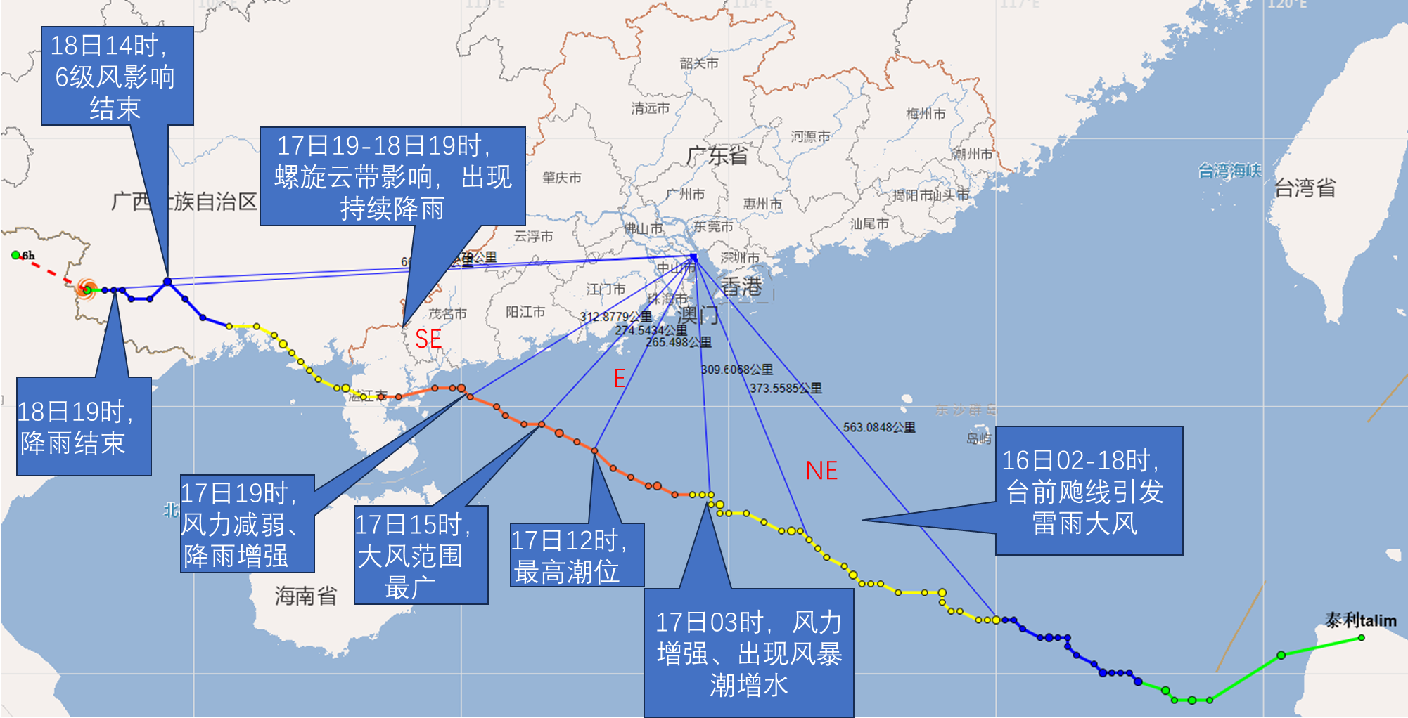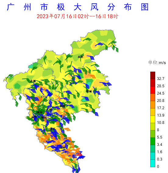16日,“泰利”在距南沙東南方向約350-550km的海面活動。期間大部分時段我市以東北風為主導風向,但在凌晨和午后,出現兩次明顯的臺前颮線自東向西影響我市,從化、增城、番禺、南沙、白云、荔灣等地出現雷雨大風天氣。全市共有83個測站(19.1%)出現短時強降水,最大小時雨強68.2毫米和最大累積雨量110.3毫米均出現在增城區正果鎮,共61個測站(13.5%)出現8級及以上陣風,南沙龍穴街錄得最大陣風28.3米/秒(10級)。