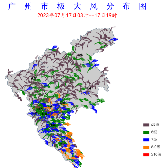 17日03時,“泰利”移動到距南沙以南約300km的南海海面,此時我市風力明顯加強,同時開始出現風暴潮增水。大風一直持續到17日19時(“泰利”距離南沙西南方向約300km),影響區域主要在南沙、番禺、市區、黃埔等中南部地區,主導風向轉為偏東風。期間低海拔地區普遍出現5~7級陣風,高地和橋梁出現8~10級陣風:南沙區龍穴街(高72米)錄得陸地最大陣風24.6米/秒(10級),白云區太和鎮帽峰山(高534米)最大陣風23.2米/秒(9級,黃埔大橋(高110米)最大陣風22.5米/秒(9級)。另外,廣州港區普遍出現8~11級陣風,其中桂山島錄得港區最大陣風29.7米/秒(11級)。據水文部門監測,風暴潮增水在17日12時(“泰利”距離南沙最近約260km)左右達到最強,疊加天文大潮的影響,各潮位站水位超警戒線1-16cm。