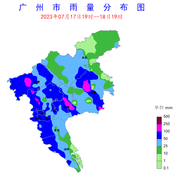 17日19時至18日19時,“泰利”逐漸西移遠離我市,與南沙區距離從300km增加至650km。期間,我市風力明顯減弱,僅港區、高地和南沙還維持6-7級陣風,主導風向自南向北轉為東南風。與此同時,我市開始受到“泰利”東側螺旋雨帶的影響,出現持續性強降雨過程,全市平均雨量50.3毫米,共有27個站點(5.7%)雨量在100~250毫米之間,171個站點(36.2%)雨量在50~100毫米之間,增城區小樓鎮錄得最大累積雨量185.9毫米。各區平均雨量(單位:毫米):越秀區87.3,海珠區73.8,白云區70.9,天河區67.6,荔灣區67,花都區60.7,番禺區54.1,黃埔區50.5,增城區48.8,南沙區36.3,從化區27.8。