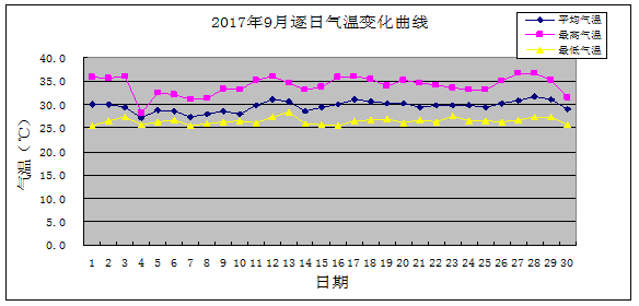 本月平均氣溫29.7℃,與累年平均值比偏高2.1℃。其中,上、中、下旬平均氣溫與累年平均值比分別偏高0.3℃、2.4℃、3.5℃,極端最高氣溫36.7℃,出現(xiàn)在27日,極端最低氣溫25.4℃,出現(xiàn)在1日。