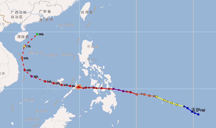 預計,“雷伊”將以每小時25~30公里的速度向偏西方向移動,強度緩慢增強,今日夜間移入南海東南部海面,繼續向偏西方向移動;19日前后將逐漸轉向偏北方向移動,向我國西沙群島附近海面靠近,強度逐漸減弱。